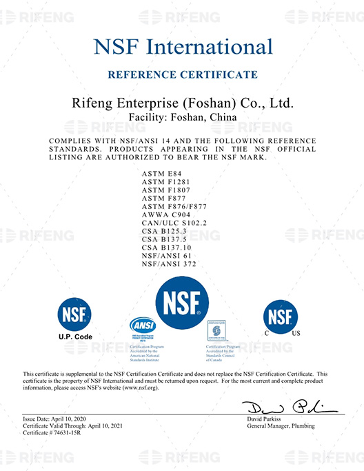 As one of the global piping system manufacturers, RIFENG has always put the safety and health of drinking water in a priority. RIFENG has got NSF/ANSI 61 certification in Multilayer Piping Systems, PEX Piping Systems, PPR Piping Systems, Braided Hoses, Valves, Manifolds, and Bathroom. Contributing to global drinking water safety. RIFNEG will guarantee the quality of its products as always.
