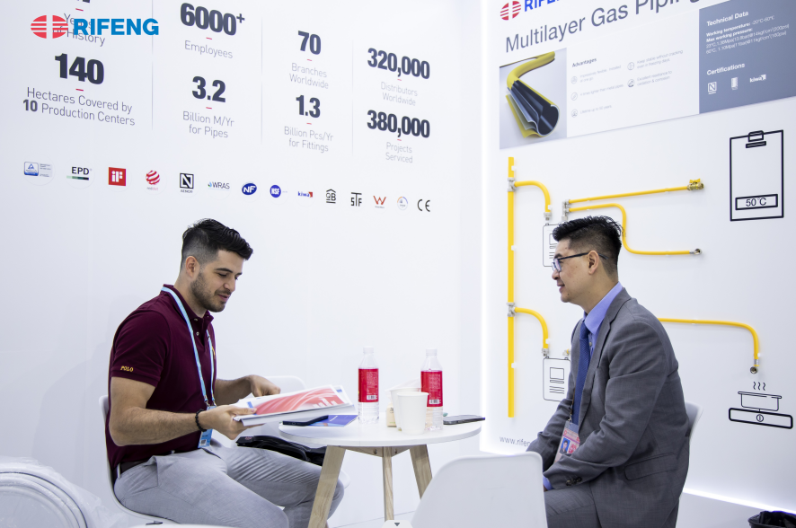 In addition to flagship products like Multilayer and PP-R Plumbing Systems, RIFENG PE-Xa Plumbing System featuring PE-Xa Pipes, PPSU fittings, and crimp fittings also stirred much interest from visitors. Last year, RIFENG launched several advanced PE-Xa production lines and significantly boosted the production capacity of PE-Xa. With trusted quality assurance, reliable mass production and supply capacity, RIFENG has become the preferred PE-Xa piping solutions provider for numerous business partners around the world.