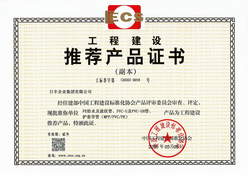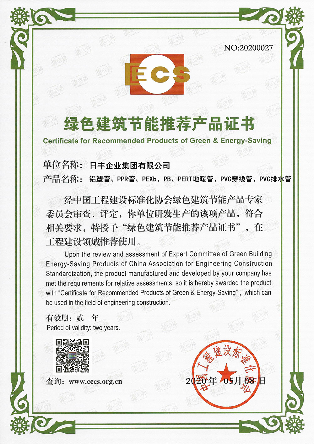 Recently, in the evaluation of "Recommended Products for Green Building Energy Conservation" and "Recommended Products for Engineering Construction" organized by the China Engineering Construction Standardization Association, more than ten products of Rifeng including PPR pipes, underfloor heating pipes, and PVC pipes were again approved and awarded the "Green Building "Energy-saving recommended products" and "Engineering construction recommended products" certification.