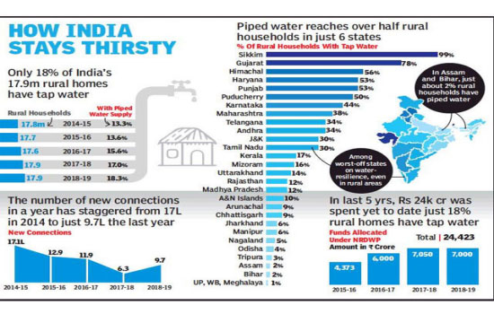 Government had launched NRDWP in April 2009. In 2013, guidelines were updated to focus on piped water supply. A CAG report on NRDWP pointed out the scheme that was supposed to provide piped water connection to 35% of rural households by 2017, had actually been able to provide piped water connections to barely 18.3% of rural households by . end of 2018-19.Data shows the slow progress under this scheme. In 2014-15, just 13.3% of India’s 17.8 crore rural households had piped water connection. In the past five years this improved by just over 5 percentage points.?